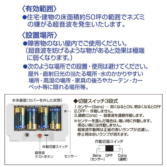ネズミの嫌がる超音波を発信し、ネズミの住みにくい環境を作ります。有害なものを発生しないので、お子様やペット、食品に対しても安全です。乾電池式なので、コンセントの無い場所への設置ができます。周囲が明るくなると作動が停止する切り替えセンサー付き。連続作動の場合は、電池消耗が約2ヶ月と短くなります。