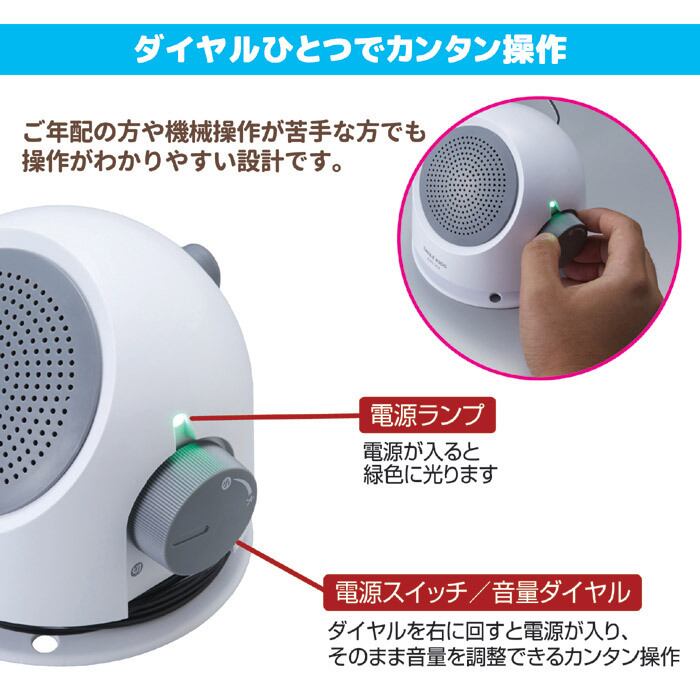 「テレビの音が最近聴こえにくくて音量を大きくしがち」、「夜間にテレビの音量を上げたくない」、そんな貴方にオススメなのが、この「手もとスピーカー2」です。ご自分の近くに置いて、テレビの音声が手もとで聞けます。取り付けが非常に簡単で、付属のマイクをテレビのスピーカーに貼り付け、本体のプラグコードと接続すれば設置完了。本体は乾電池式なので、5mのプラグコードが伸ばせる場所ならどこでも使用可能です。この状態なら、テレビからの音量は通常通りに使え、ご家族でお楽しみいただけます。また、マイクを使用せず、テレビの音声出力端子に直接プラグコードを差し込んでも使用できます。この場合、テレビの機種によっては、テレビ本体のスピーカーからの音声を「出す」「止める」の設定をする必要がありますので、ご注意ください。設置が完了すれば、後は本体右側の大きなツマミを回すとスイッチオン。さらに回すとボリューム調整ができます。音も非常にキレイに出る手もとスピーカー2を是非、お試しください。