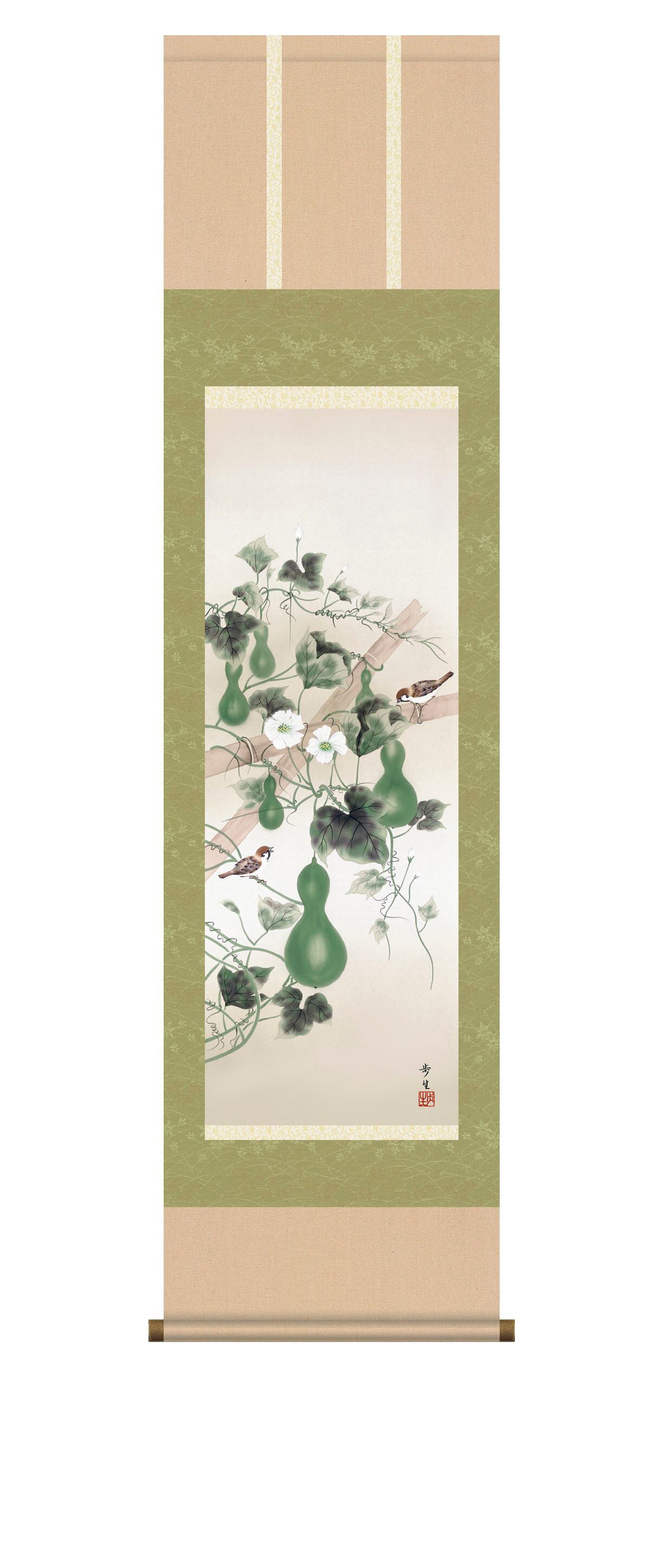 繁殖期に害虫を啄ばむことから難を啄ばむと伝えられる仲睦まじい夫婦雀が愛らしさを添え、爽やかな色調がお部屋に一服の清涼感を誘ってくれることでしょう。