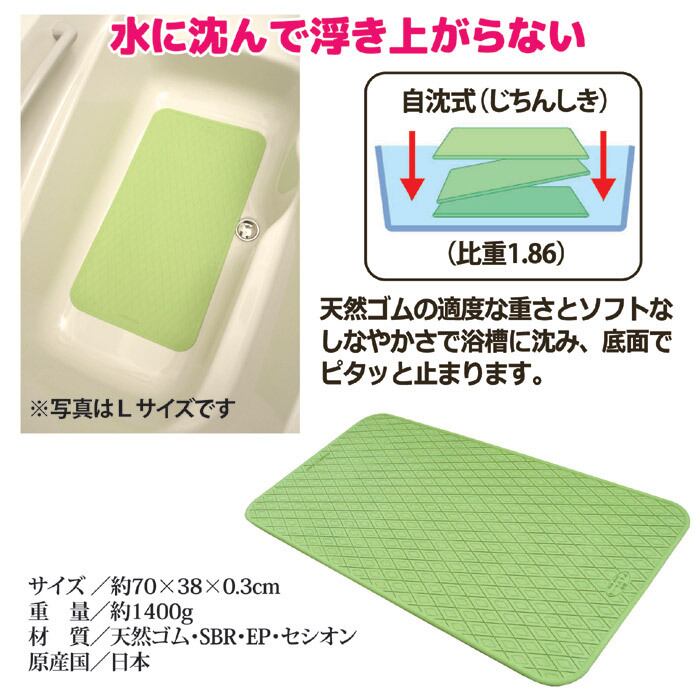 お風呂での転倒による事故は大変危険です。ゴム製品の産地として有名な神戸から発信された本品は、浴室の洗い場や浴槽内に敷くことで浴槽のヌメリや石鹸の泡などによる転倒を防止します。自沈タイプなので湯船に沈み、浴槽内の滑り止めとして使えます。吸盤式のマットとは違い、滑り止め効果が薄れることなくお使いいただけます。天然ゴムに特殊素材「セシオン」を配合することで、マイナスイオンと遠赤外線を発生させ足元の冷えも防いでくれます。