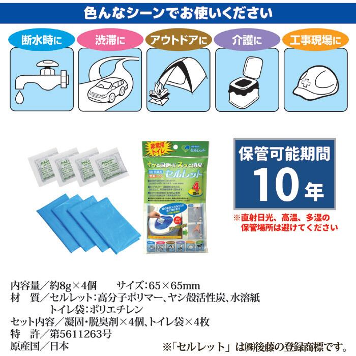 地震などの災害時、万が一、送電や水道がストップしたら困ってしまうのがトイレです。防災のための備えとして、避難用具や食料品などは思いついても、排泄のことまで考えて備える人は少ないようです。しかし、実際にはライフラインがストップすると、トイレでの排泄はできなくなってしまいます。実際、東日本大震災では、トイレ難民が約82万人も出ました(中央防災会議の専門調査会調べ)。そこで、そんな時でも排泄ができるように開発されたのが「セルレット®」。排泄物を固めてしまうのはもちろんのこと、イヤな悪臭を特殊な活性炭(ヤシガラ活性炭)を配合することで、臭いも抑えることができます。